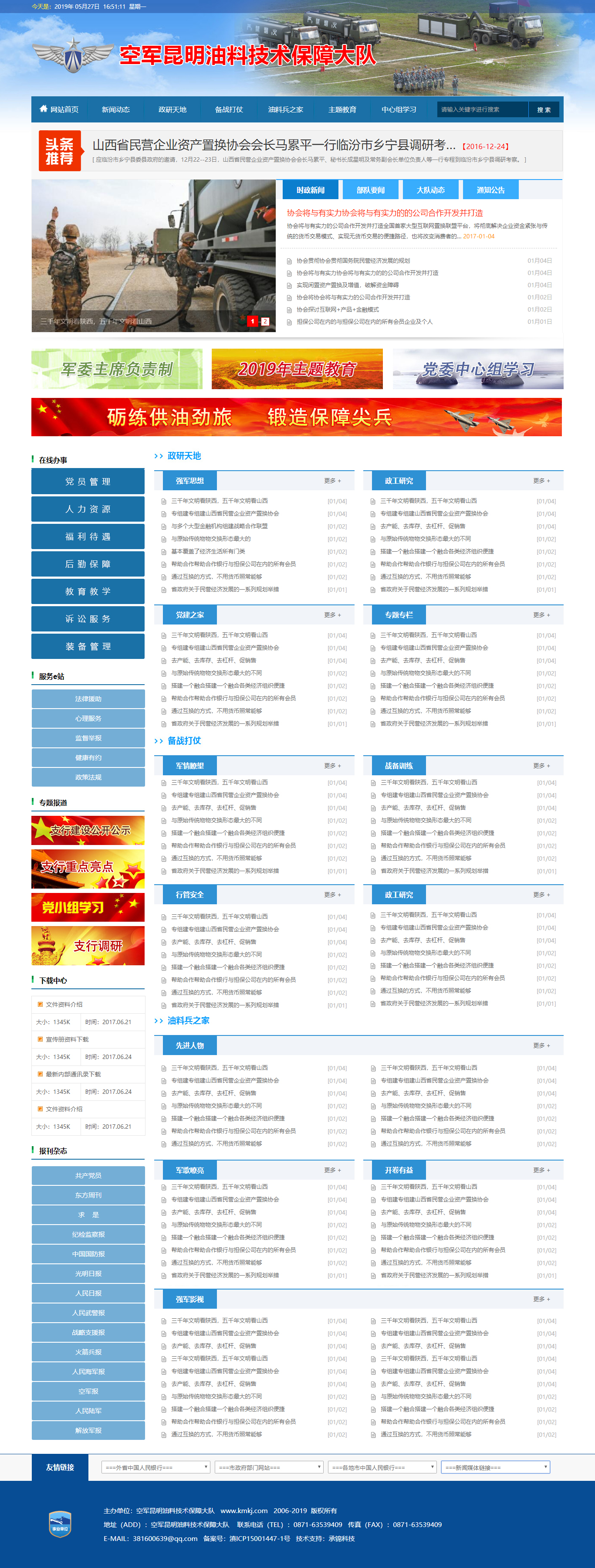 空軍昆明油料技術保障大隊官方網站由云南承錦科技有限公司提供技術支持,網站包含欄目:網站首頁/新聞動態(tài)/政研天地/備戰(zhàn)打仗/油料兵之家/主題教育/中心組學習等。